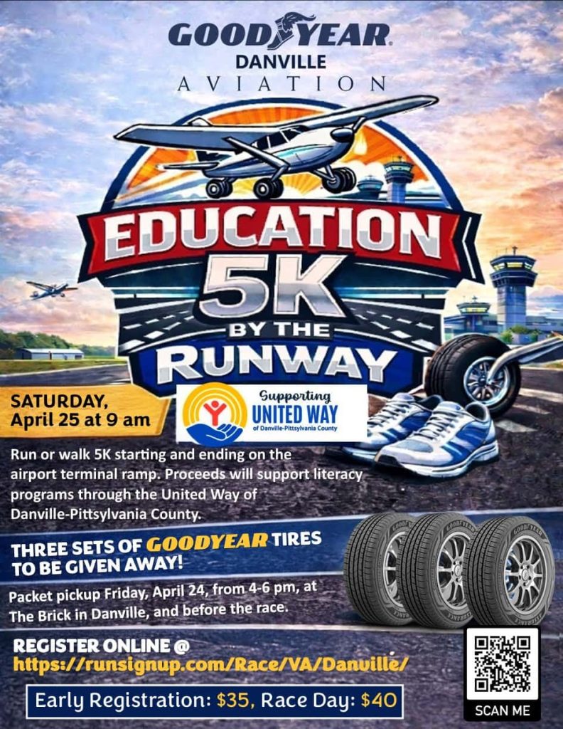 Join Goodyear Danville Aviation for the Education 5K by the Runway on Saturday, April 25 at 9:00 AM. This fun run/walk starts and ends on the airport terminal ramp, with proceeds supporting literacy programs through United Way of Danville-Pittsylvania County. Participants can register online, pick up packets on Friday, April 24 (4–6 PM) at The Brick in Danville or before the race, and will have a chance to win three sets of Goodyear tires.
